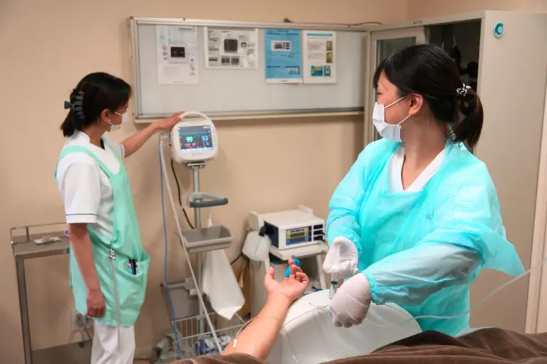 点滴の横(側管)から、鎮静剤を注入。鎮静の状態を生体情報モニターでモニタリングします。